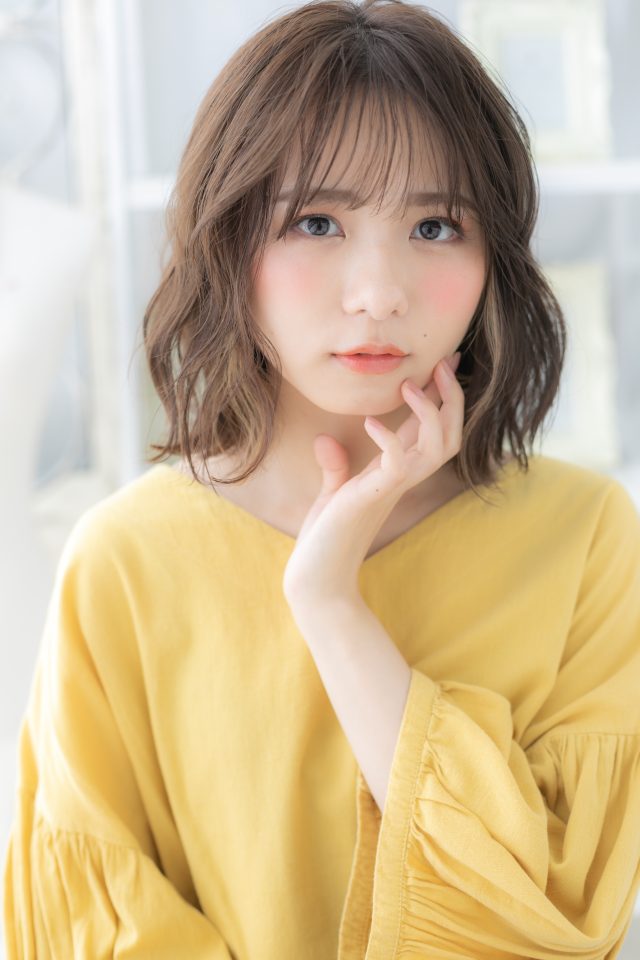 シースルーバングや斜めバング、厚めバングで小顔。ナチュラルボブフェミニンボブ、大人ボブ前下がりボブからのイメチェンに◎くせ毛風ゆるふわミディや耳かけ前下がりも大人かわいい。(メイク担当:COVERHAIRGROUP岩淵)