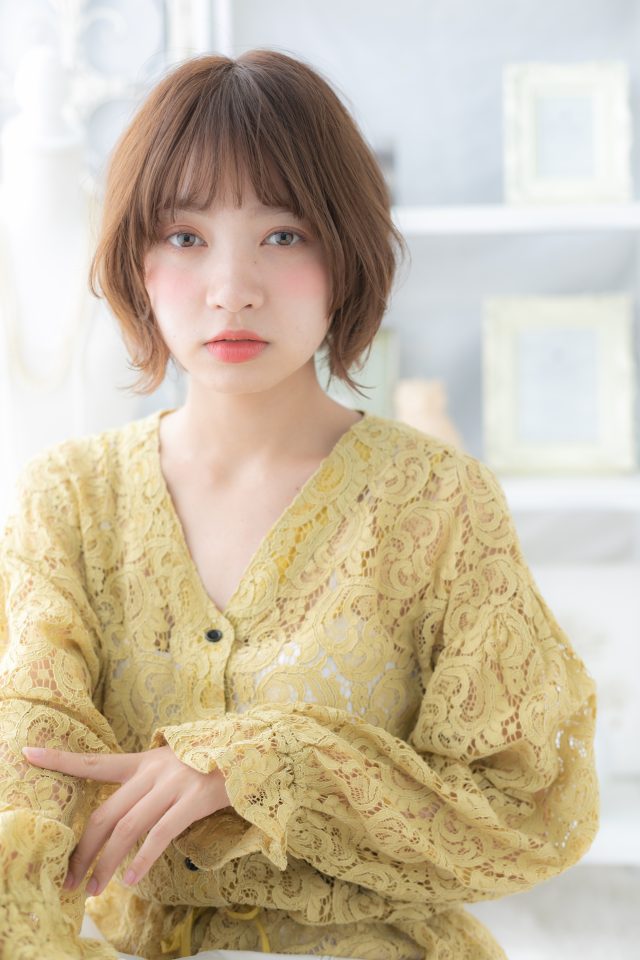 くせ毛風ゆるふわミディや耳かけ前下がりウルフで小顔。ナチュラルボブフェミニンボブ,大人ボブ前下がりボブ,切りっぱなしボブも大人かわいい。斜めバング厚めバング,シースルーバングも◎(メイク担当:上尾店 中田)