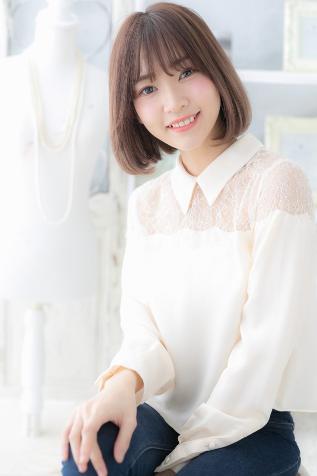 斜めバング厚めバング、シースルーバングが大人かわいい。ナチュラルボブフェミニンボブ、大人ボブ前下がりボブ、切りっぱなしボブで小顔。くせ毛風ゆるふわミディや耳かけ前下がりウルフも◎(メイク担当:上尾店 中田)