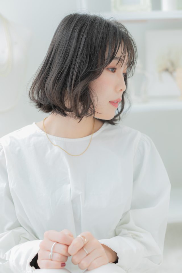 斜めバング厚めバングシースルーバングで小顔。ナチュラルボブフェミニンボブ,大人ボブ前下がりボブ,切りっぱなしボブも◎くせ毛風ゆるふわミディや耳かけ前下がりウルフも大人かわいい。(メイク担当COVERHAIRGROUP成田)