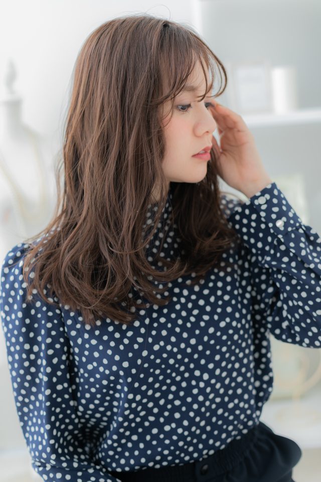 斜めバング厚めバングシースルーバングで小顔。くせ毛風ゆるふわミディや耳かけ前下がりウルフが大人かわいい。ナチュラルボブフェミニンボブ,大人ボブ前下がりボブ,切りっぱなしボブも◎(メイク担当COVERHAIRGROUP成田)