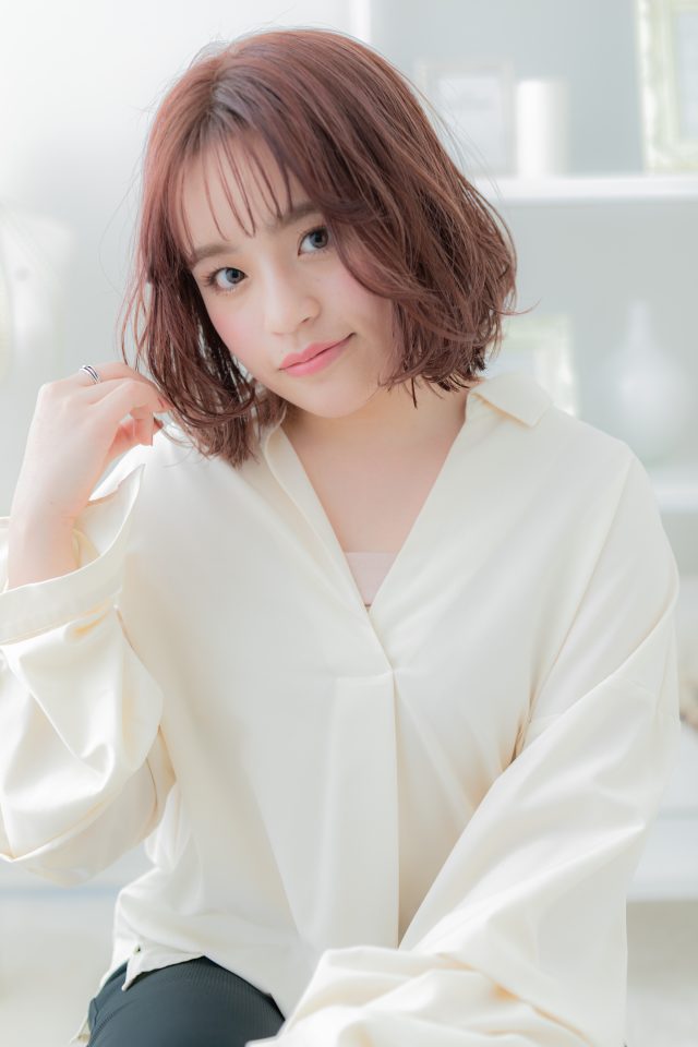 ミルクティーピンク韓国風ゆる巻き大人ボブ