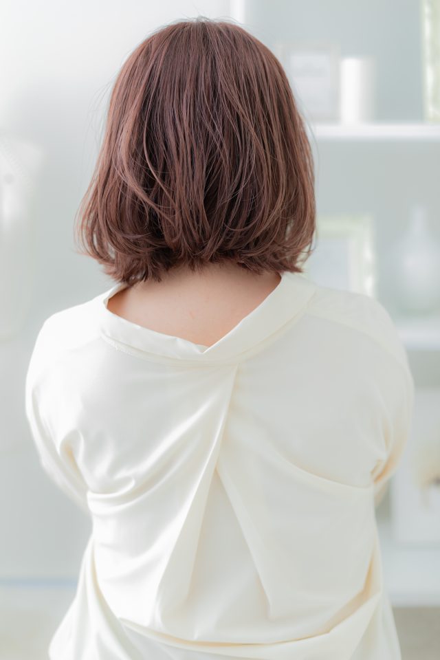 ナチュラルボブフェミニンボブ,大人ボブ前下がりボブ,切りっぱなしボブが大人かわいい。斜めバング厚めバングシースルーバングで小顔。くせ毛風ゆるふわミディや耳かけ前下がりウルフが◎(メイク担当COVERHAIRGROUP成田)