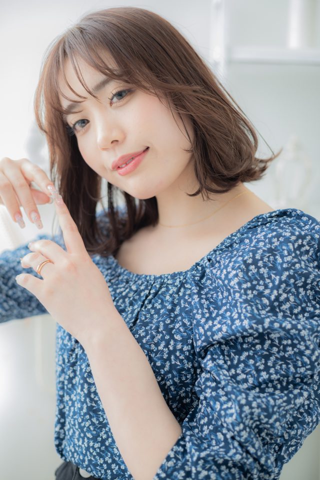 くせ毛風ゆるふわミディ,耳かけ前下がりウルフが大人かわいい。フェミニンボブ大人ボブ,ナチュラルボブ切りっぱなしボブから伸ばしかけに。斜めバング厚めバングシースルーバングで小顔。(メイク担当COVERHAIRGROUP成田)