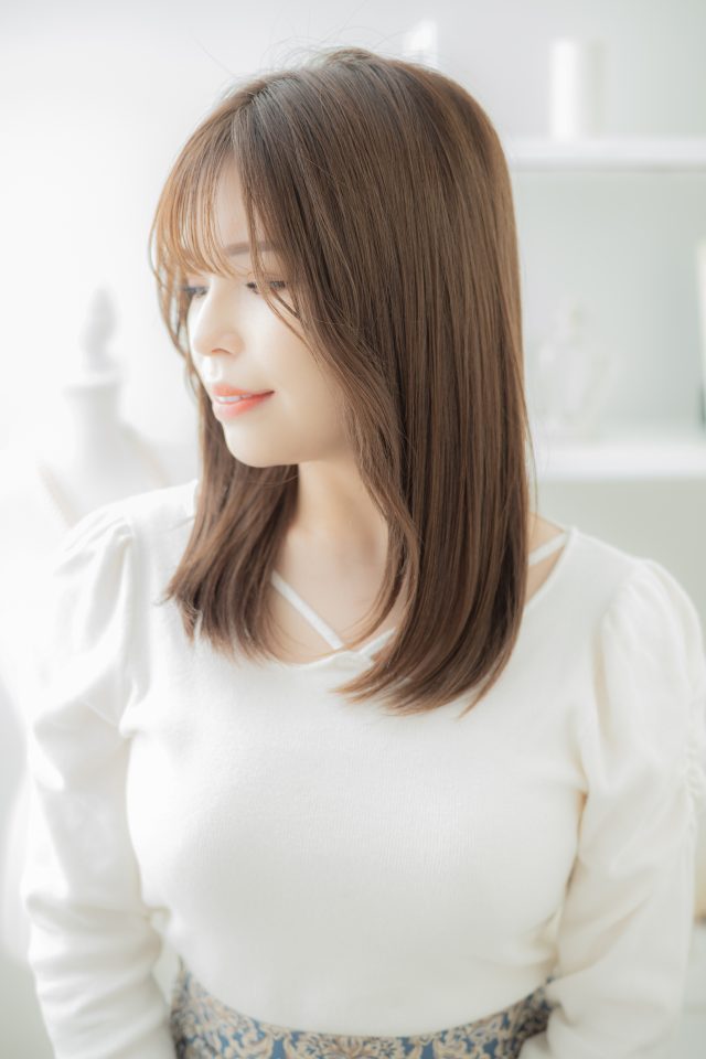 斜めバング厚めバングかきあげ前髪で小顔。くせ毛風ゆるふわミディや耳かけ前下がりウルフも大人かわいい。ミニボブマッシュボブ、ナチュラルボブフェミニンボブ、大人ボブ前下がりボブも人気。(メイク担当:上尾店大西)