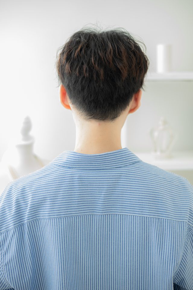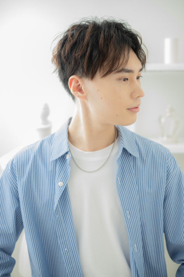 センターパートで爽やかな印象のナチュラルマッシュショート。くせ毛風ニュアンスパーマで動きを出してセクシーに。刈り上げやツーブロックで毛量調節しながらラフクールに決めてモテ髪。(メイク担当COVERHAIRGROUP岩渕)