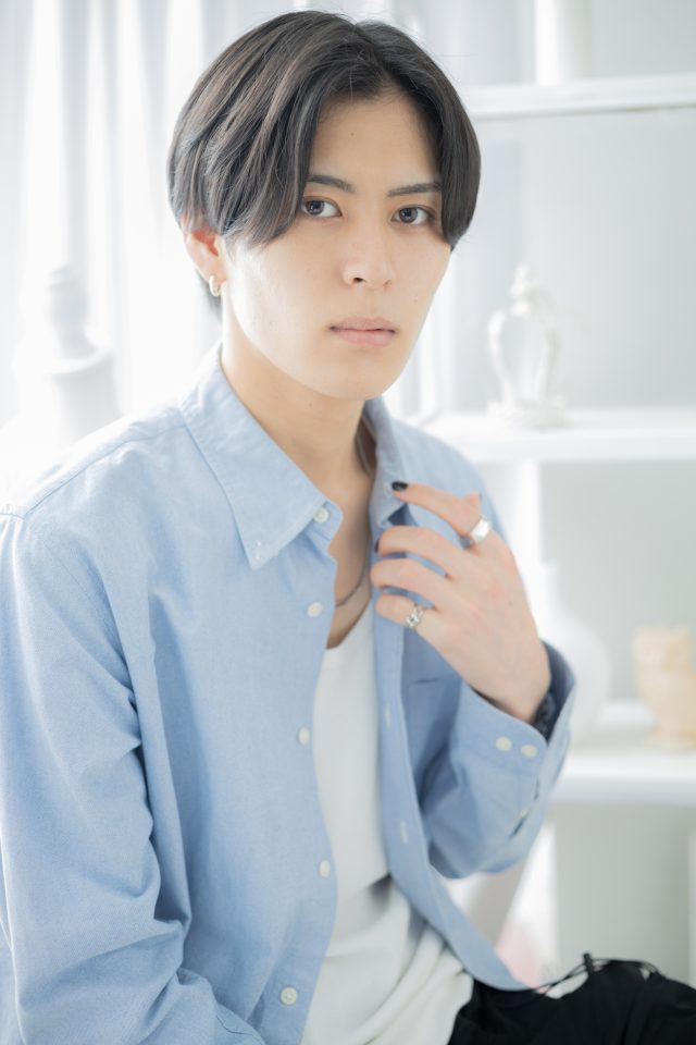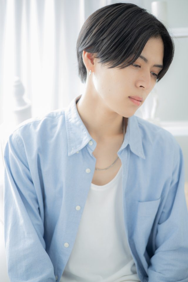 前髪を立ち上げた黒髪センターパートのテクノカット。ビジネスでも使える好感度の高い爽やかスタイル。グレージュカラーやアッシュブラック、オーガニックカラーやアースカラーでクールなモテ髪に仕上げてもOK。