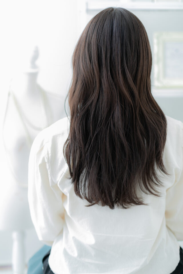 黒髪ダークアッシュくせ毛風小顔波巻きロング