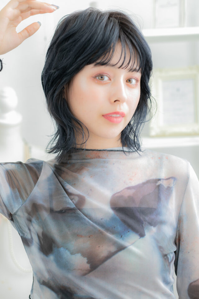 ブルーグレージュ小顔透け感ミディアムウルフ