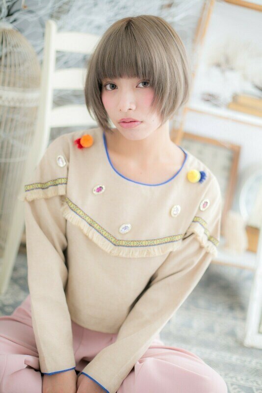 透明感あるサラツヤマッシュボブ。ハイトーンのミルクティカラーでナチュラルより一歩踏みこんだインパクトを楽しんで。ピュアで個性的なオシャレガーリースタイルです♪サイドのカットラインをつけた姫カットも可愛い☆