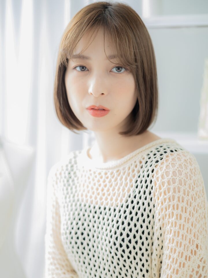 斜めバング厚めバング、かきあげ前髪で小顔。くせ毛風ゆるふわミディや耳かけ前下がりウルフも大人かわいい。大人ボブマッシュボブ、ナチュラルボブフェミンボブ、ミニボブ前下がりボブも人気。(メイク担当:上尾店大西)