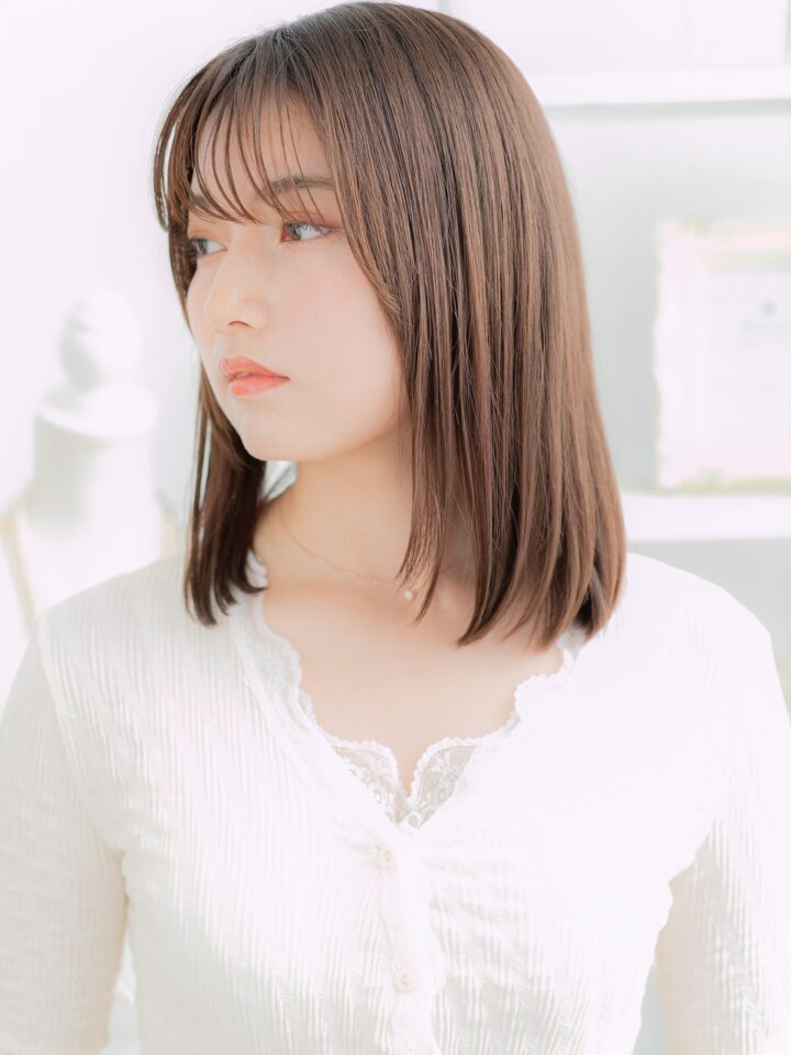 前下がりボブ大人ボブ、フェミニンボブミニボブから伸ばしかけに。斜めバング厚めバング、シースルーバングかきあげ前髪で小顔。くせ毛風ゆるふわミディや耳かけ前下がりウルフも大人かわいい。(メイク担当:上尾店大西)