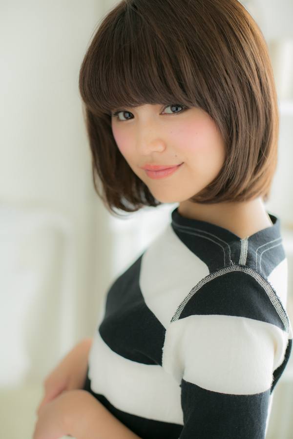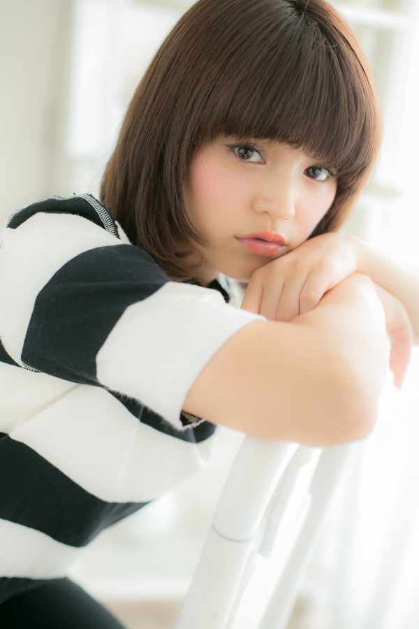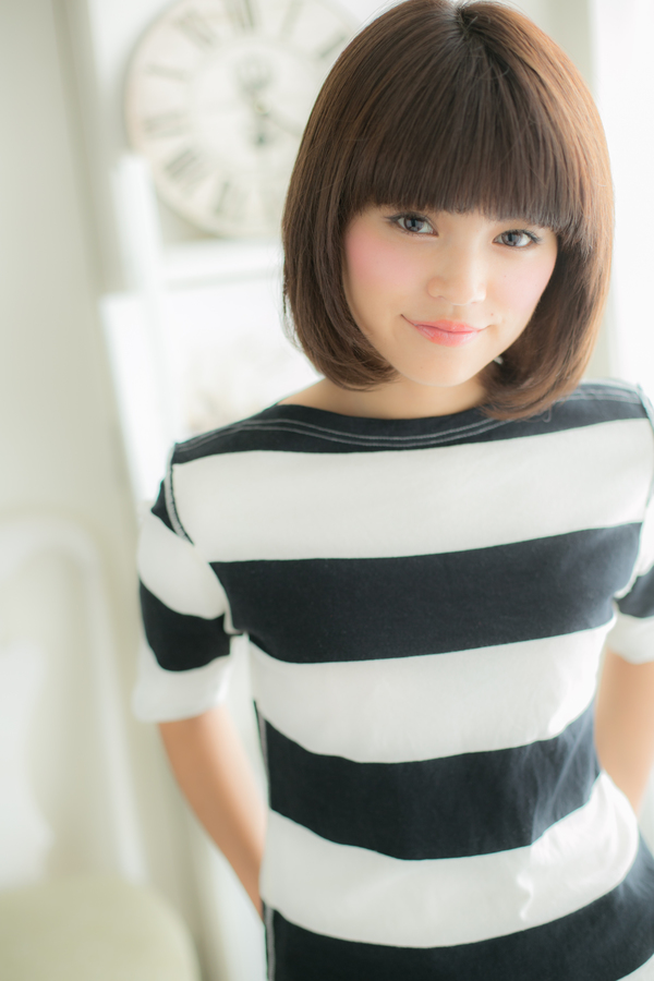 ナチュラルボブのピュアな可愛さとダークトーンのカラーが絶妙な甘辛スタイル☆厚めバングが小顔効果もUPさせまとまりある艶やかな質感がポイント。ぱっつんバングが印象的♪前下がりボブや耳かけで雰囲気を変えてもGOOD!ほつれウェーブでウェービーボブも☆