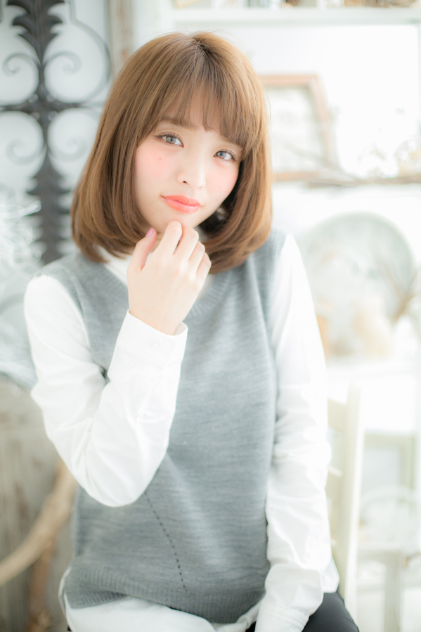 ローレイヤーの重めスタイルに、明るいベージュカラーをオンすることで軽さもでます。中間にはストレートパーマがかかっているので基本は乾かすだけで再現できるので毎朝のセットの時間も短縮に♪
