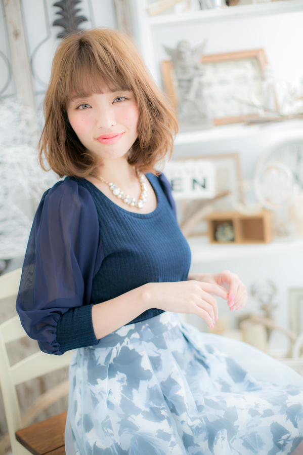 肩の上あたりにふんわりとしたカールをつけて、エアリーなミディアムスタイルを作りました。前髪にも少し毛先にカールがついているので、くせ毛の外人さんの様な印象にも☆