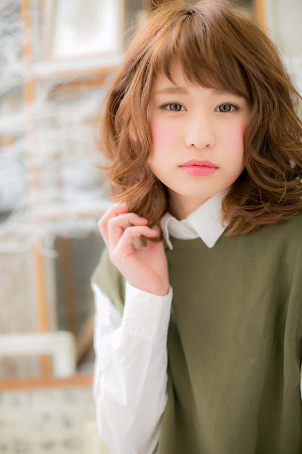 ランダムにかかったカールでふんわりボリュームたっぷりのミディアムスタイルです。前髪はスライドカットでシースルーな軽さをだして、バランスいい重軽スタイルに♪