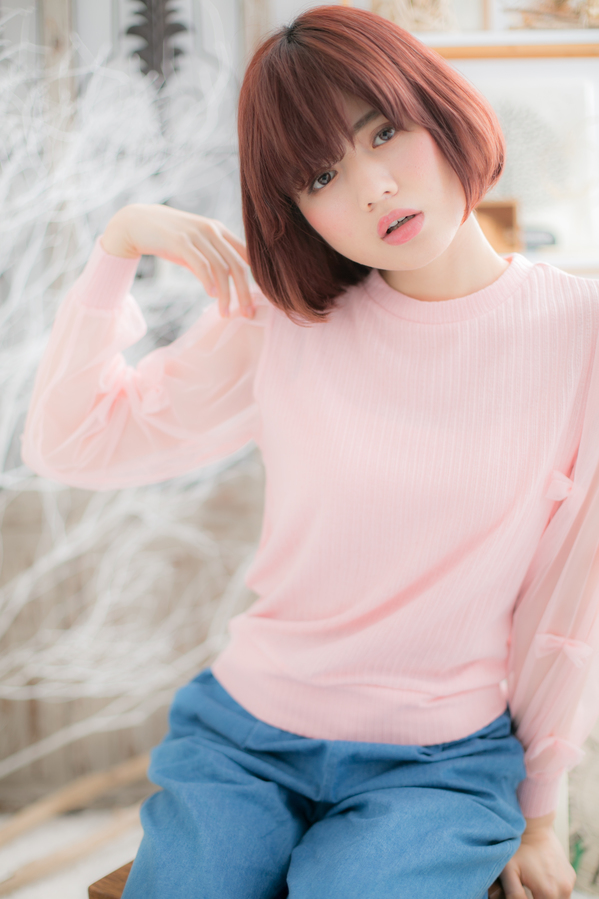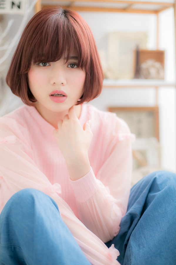 ナチュラルなボブスタイルにレッド、ピンク系のカラーで個性をプラス☆前髪も目の上ギリギリラインで目力もUPさせます♪広がりやすい方はナチュラルストレートをかけると◎