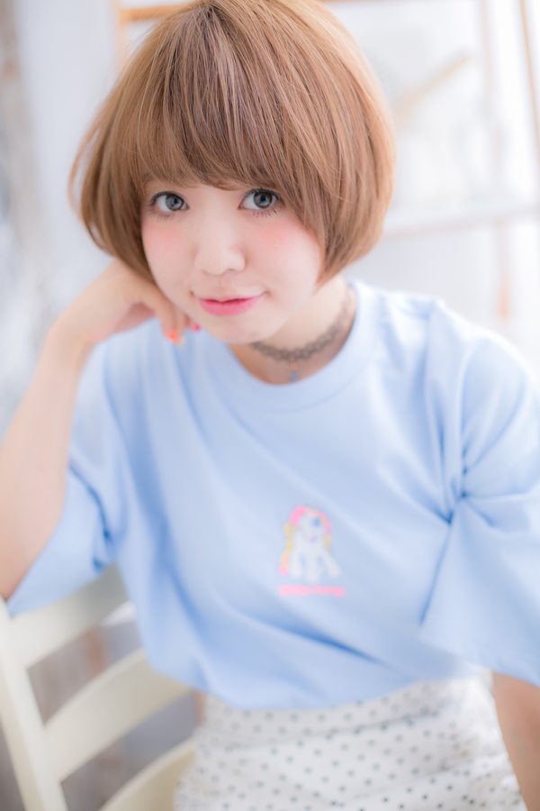 赤みのない透明感あるハイトーカラーでツヤ感を出した、コンパクトフォルムのナチュラルボブ。コロンとした可愛らしいシルエットが小頭効果も引き出します☆