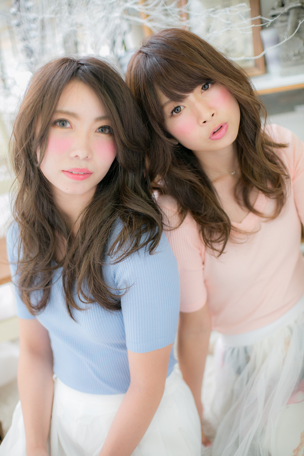 ワックスオイルを使用し、束感を毛先に出すだけでOKの簡単スタイリングが嬉しい。共に大き目のゆったりウェーブなので、ウェーブを持ち上げる様に出してセット。