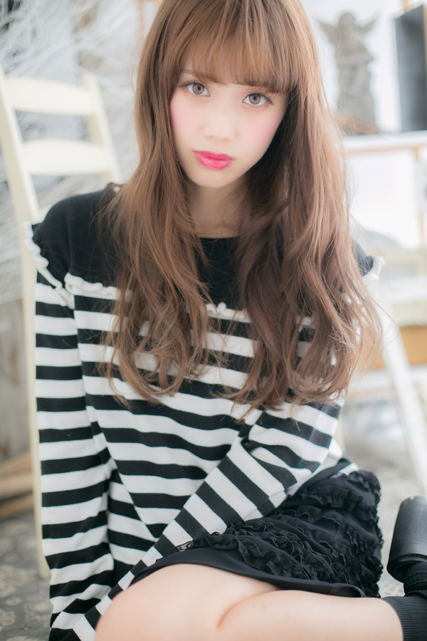 目元を印象付ける透け感あるシースルーバングと、揺らめくゆる巻きカールでとびきりガーリーにした愛されロング。女子の憧れモテスタイルです。