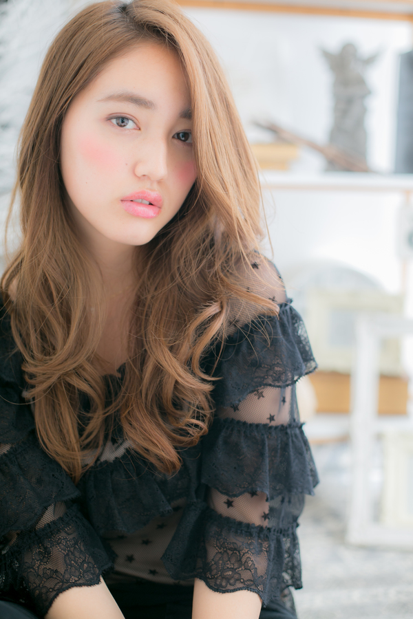 透明感ある明るめのベージュカラーと、海外セレブのようなたっぷりのボリュームカールで胸元を華やかにし、視線集中のモテロングに♪ざっくりまとめただけのスタイルも、色っぽさUP。