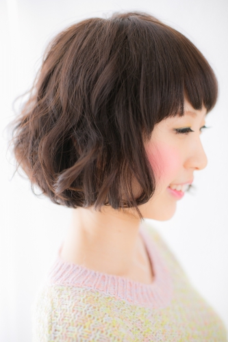 毛先のカールが柔かな,重ためボブは高感度バツグン!トップはふんわり,裾には重さを残した柔かなボブは女性さしさと品の良さもあり,愛されヘアー。オレンジベージュ,アッシュベージュもオススメ!小顔効果の大人ボブ,厚めバングで大人かわいい,ふわミディ♪