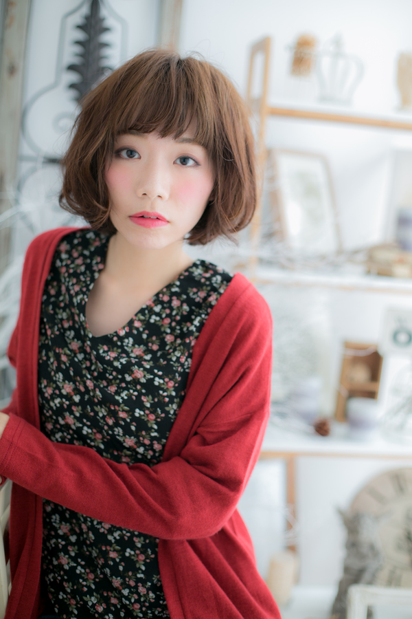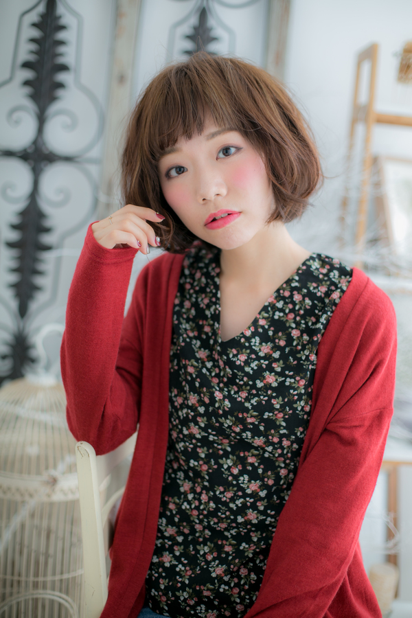 短めバングと、ローライトの入ったグラデカラーがカジュアルなガーリースタイルに♪いつものボブスタイルに変化をつけたい時はグラデカラーやアクセントカラーがオススメです。くせ毛の方はパーマ無しでもOKなニュアンスパーマが丸みをプラスしてくれます。