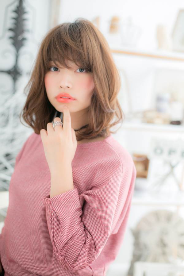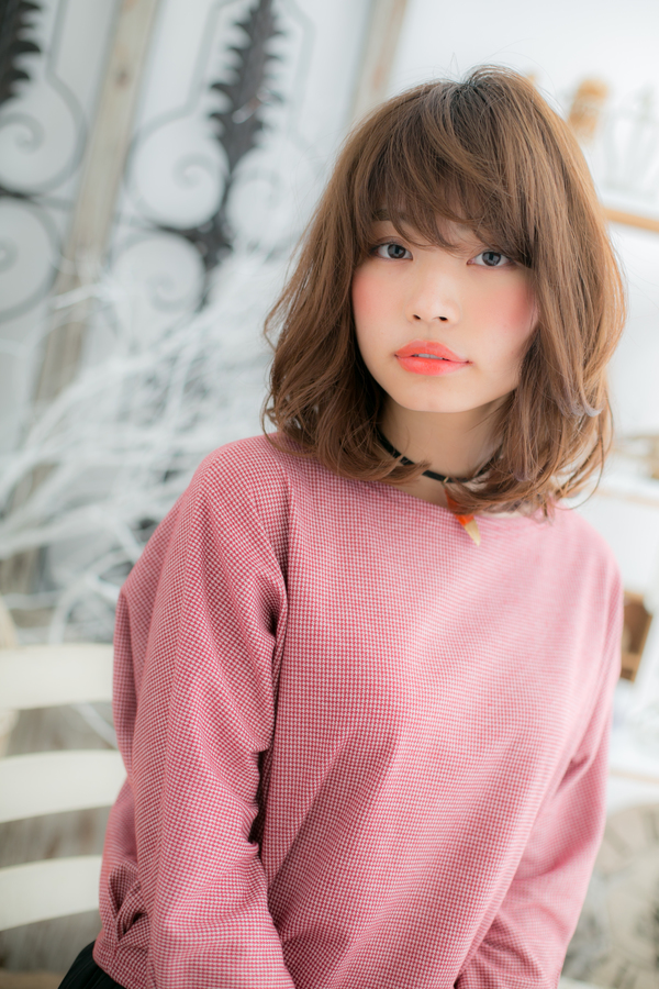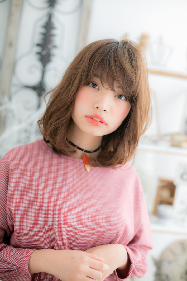 目の上ギリギリの長めバングとゆるふわ内巻きカールで重めに仕上げたミディアム。しっとりまとまりつつも、ふわっと軽やかな印象に♪