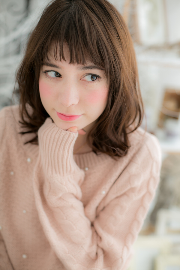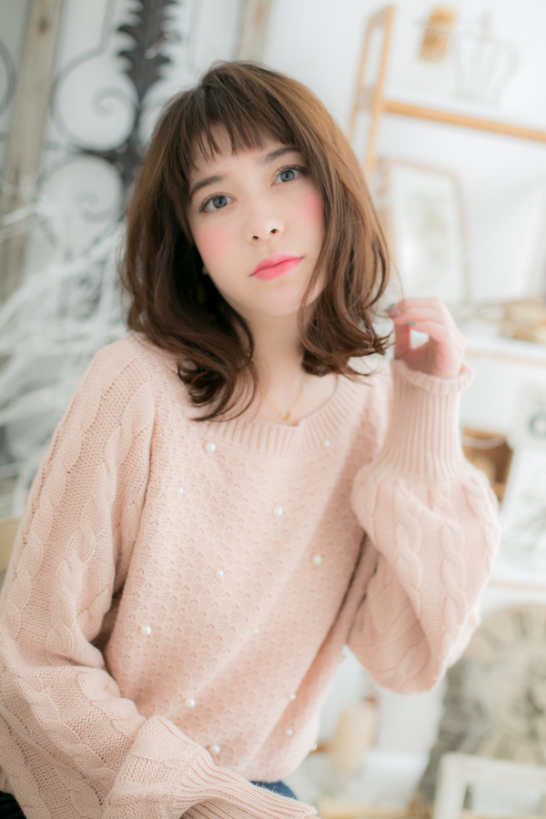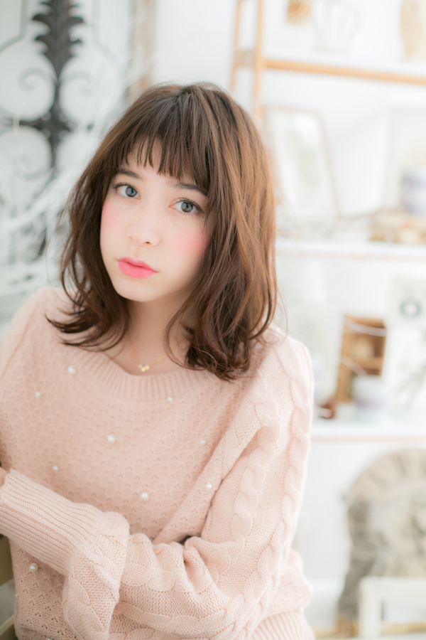 ラインの出る個性的な短めバングに重く見えない透け感が可愛い前髪と、ゆるふわウェーブがポイント☆子どもっぽくなり過ぎないよう、深みあるダークトーンで落ち着いた印象に。