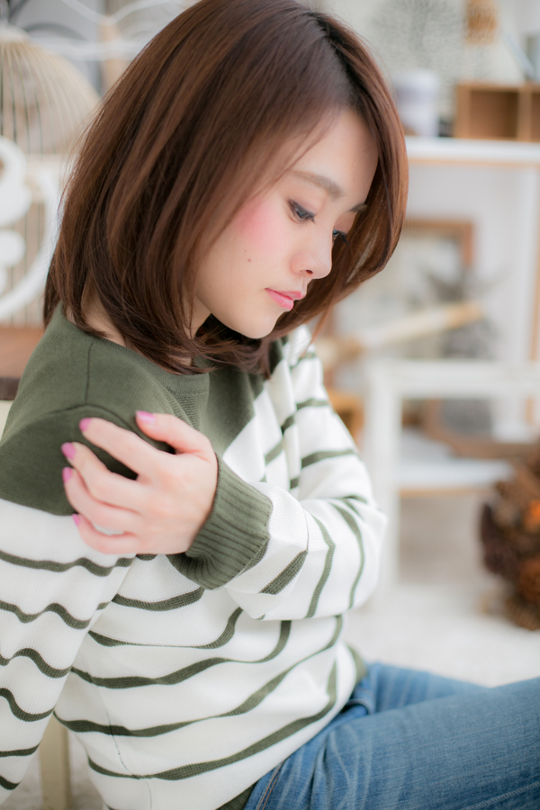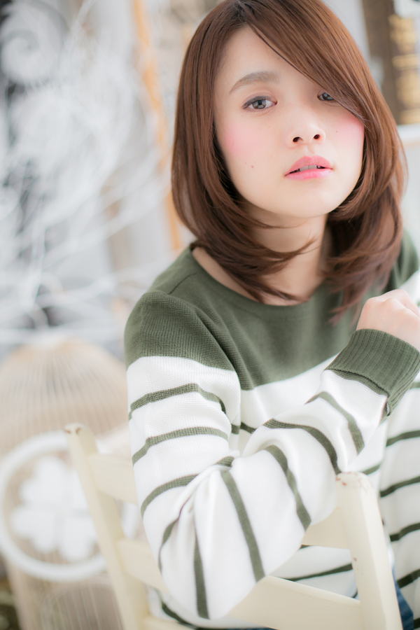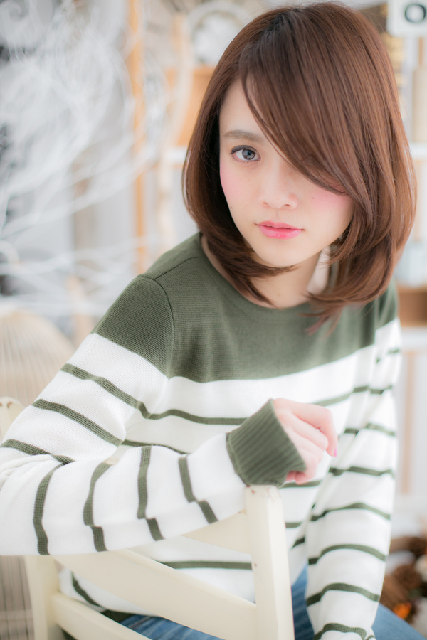 顔だちを綺麗に見せてくれるひし形フォルム。サイドに流した斜めバングは、シンプルながらも艶っぽくてGOOD。ツヤカラーで肌色を明るく毛先のレイヤーで軽やかに見せて、上品な清潔感をKEEP!