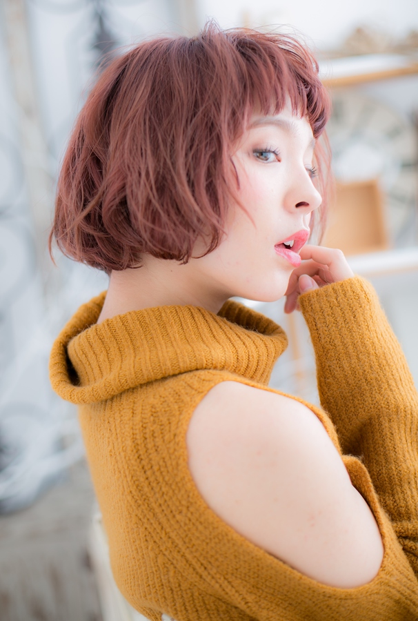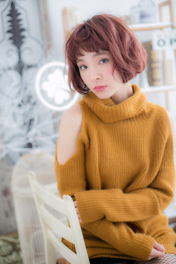 眉見せショートバングがちょっぴりレトロでオシャレなウェーブボブスタイル。周囲と差のつくレッド系カラーで個性的な仕上がりに。表情を明るくするだけでなく、美白に見せてくれますよ。