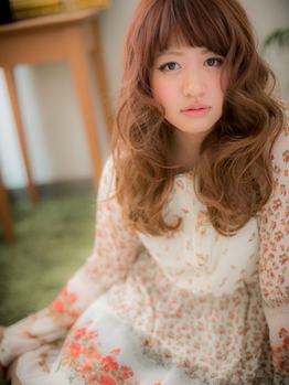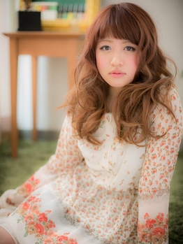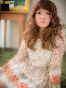 ふわっふわで、可愛い!とことんガーリーなパーマスタイル。厚めバングで目元を強調し、眉ラインから大き目カールをしっかり出すことで、お人形さんのような雰囲気に♪愛され度UP間違いナシ!!