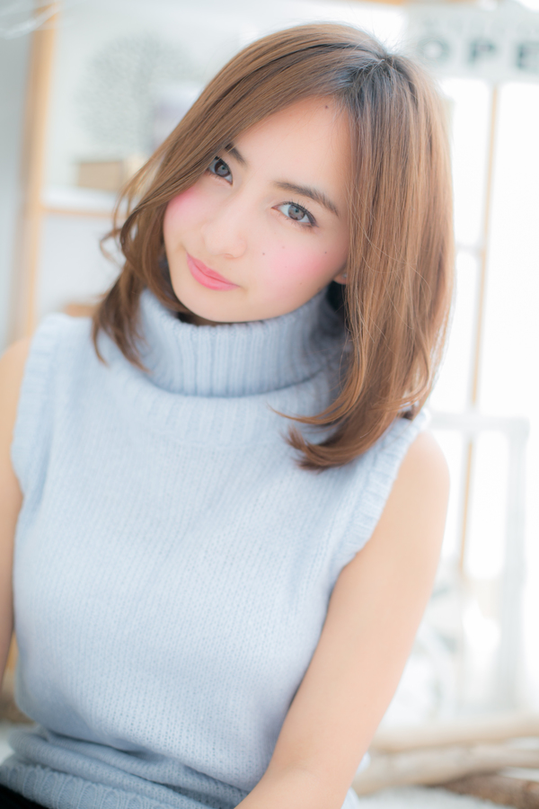 ツヤ感重視のワンカールストレート。ノーバングで知的な印象。透明感あるカラーでフェミニンな清潔感をプラスして、ピュアでイノセントな雰囲気に。ベージュカラーやメルトカラーで旬顔に。(メイク担当:北浦和店 棟方)