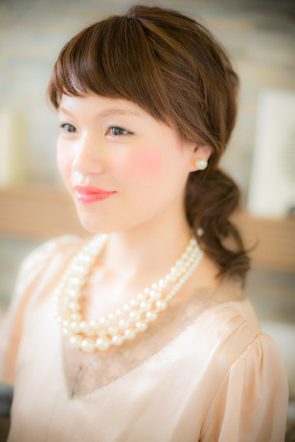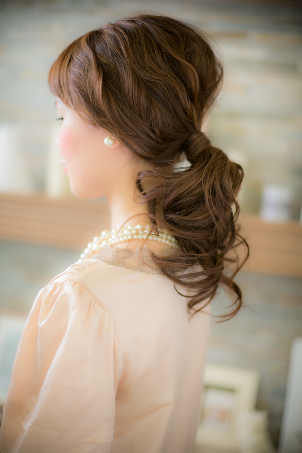 あえて、くしゃっと感を出すため、コテ巻きを根元からトップを引き上げながらも両耳に毛がかかるイメージでダウンにまとめる。個性的やクラシカルなスタイルもご相談ください。