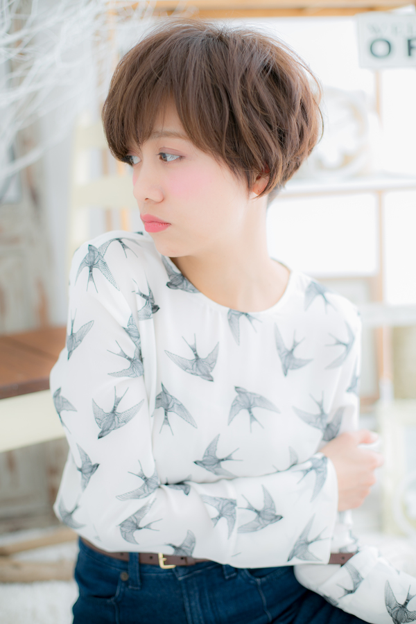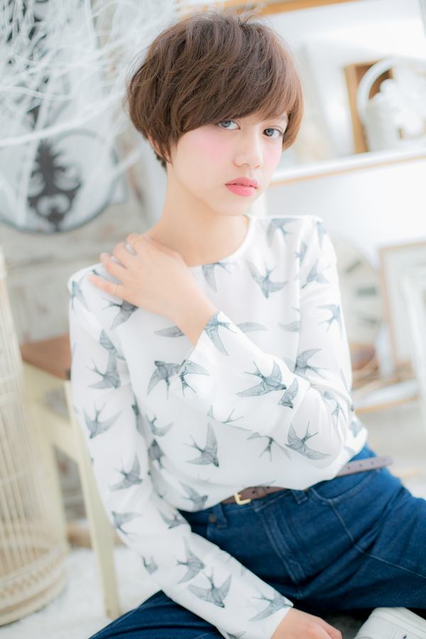 コンパクトフォルムの丸みあるマッシュショートは小頭効果大!スタイルアップを狙います。くせ毛風のニュアンスカールで動きを出し、アシンメトリーなアレンジで無造作に仕上げれば、ラフカッコイイ個性的ショートに。