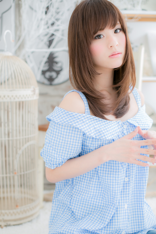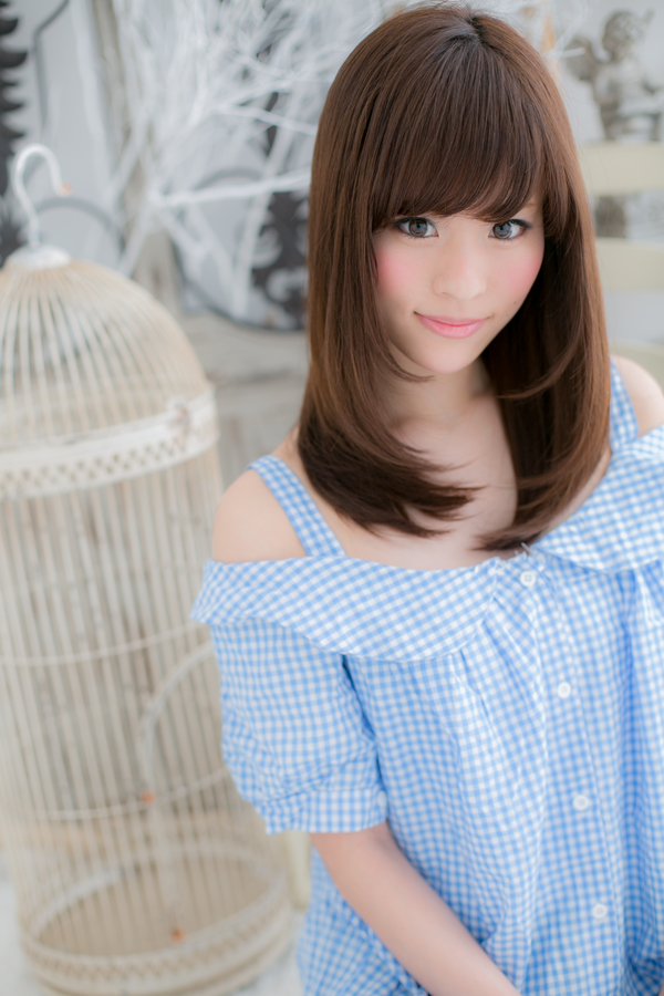 厚めのフリンジバングとツヤ感あるベージュカラーで、しっとりまとまる愛されセミディに。顔周りを包みこむサイドの毛流れで小顔に見せます。レイヤーで軽さを出し、重めスタイルでも大人かわいい重軽MIXストレートに♪
