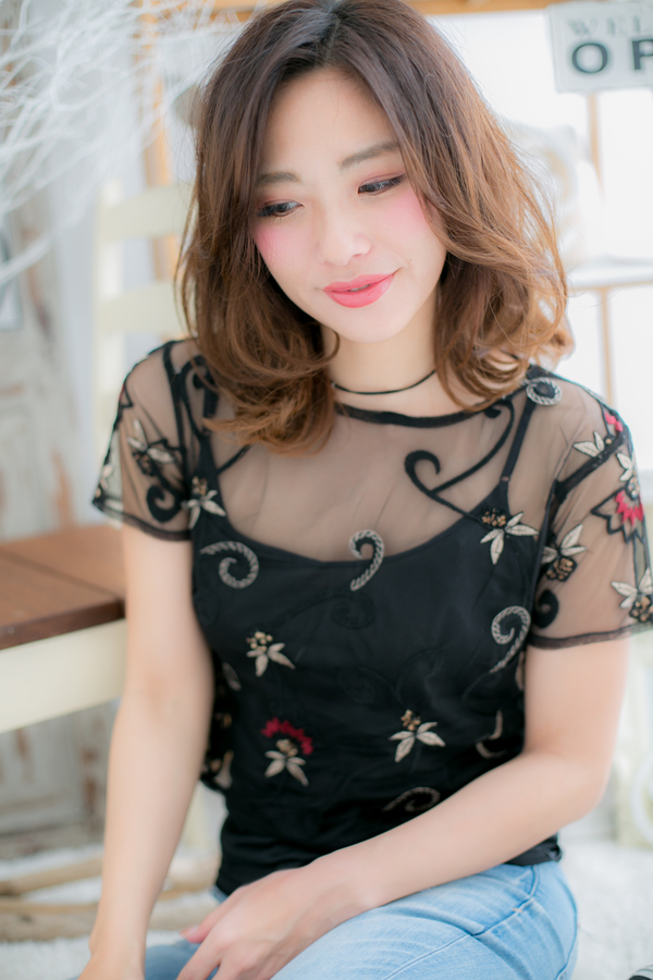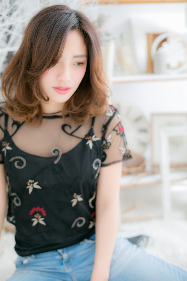 ノーバングとニュアンスカールでラフに仕上げたエアリーミディ。無造作にかきあげて、こなれ感を出してもGOOD。ベージュカラーやグラデーションカラーで立体的に仕上げて表情豊かに。セミウェットな質感もセクシーで◎