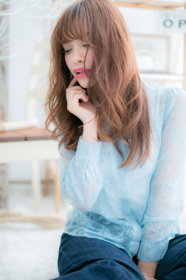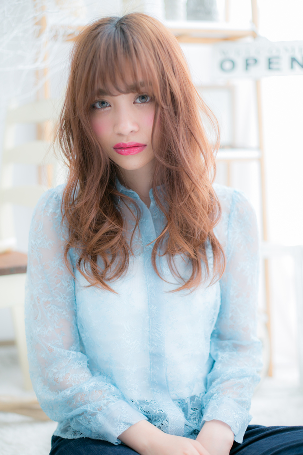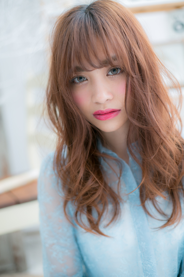 パッと目を引く明るいピンクベージュやオレンジベージュのスパイシーロング。派手な印象になりがちなグラマラスロングは、ダレ落ちウェーブで抜け感を出して、ラフで無造作な仕上がりに。ワンサイドに流してもsexy♪