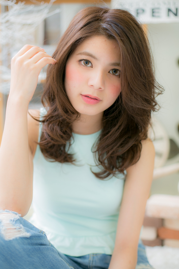 うざバングがクールなフェミニンさある大人かわいい印象を演出。イノセントカラーやベージュカラーで透明感をUP。くせ毛風のカールでヘアアレンジもしやすくGOOD。