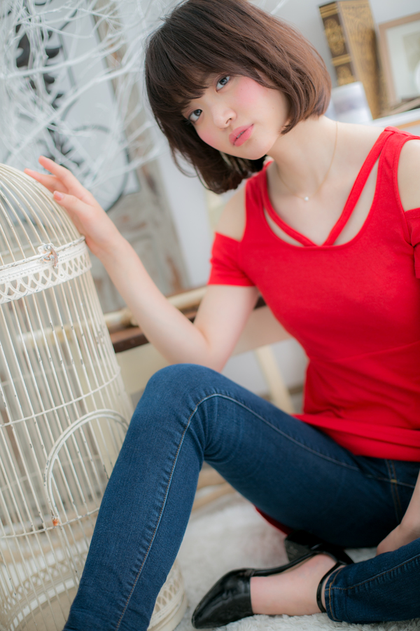 ノームコアなワンカールストレートミディ。輪郭をカバーして小顔に見せ、斜めバングで目元を印象つけて目力UP!ナチュラルスタイルは質感で差をつけて。モーブカラーでしっとりと。(メイク担当:COVER HAIR GROUP 棟方)
