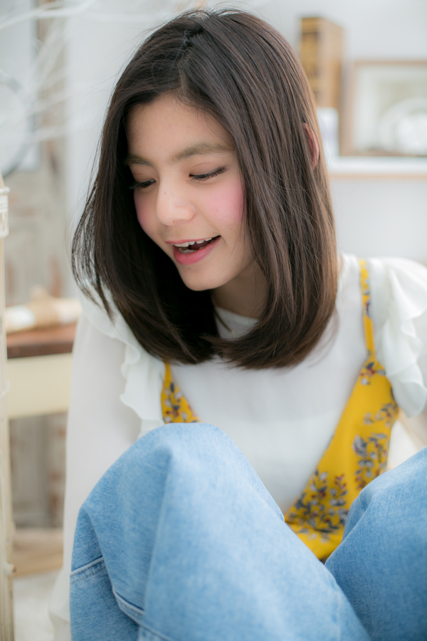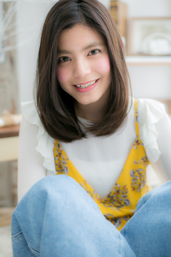 ローレイヤーのワンカールストレート。重めスタイルでもツヤと透明感あるモーブカラーで、軽やかでイノセントな愛され好感スタイルに☆(メイク担当:COVER HAIR GROUP 成田)