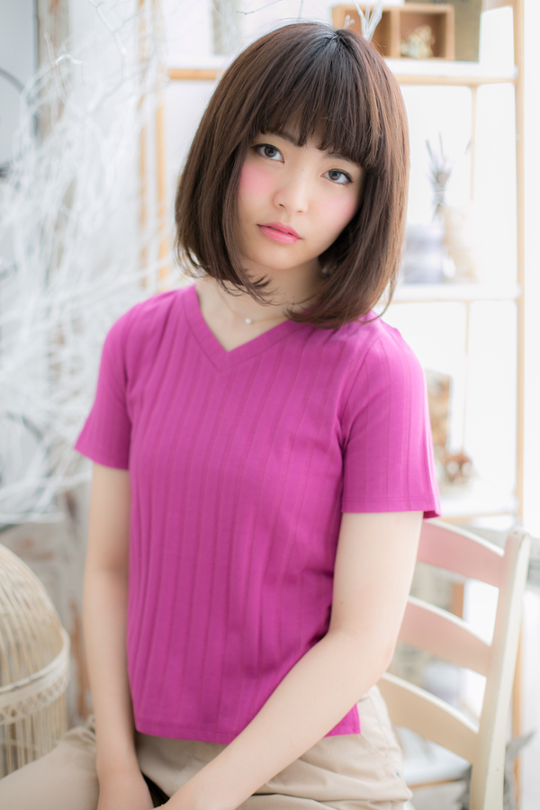 目元を印象つけるワイドバングで目力UP!顔周りを包み込む前下がりのラインで、フェイスラインをカバーして小顔に見せます。耳かけでガーリーにしても大人かわいい。洗い流さないトリートメントやオイルで保湿をしっかりと。