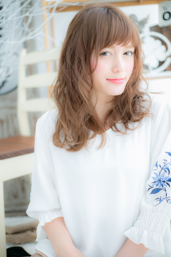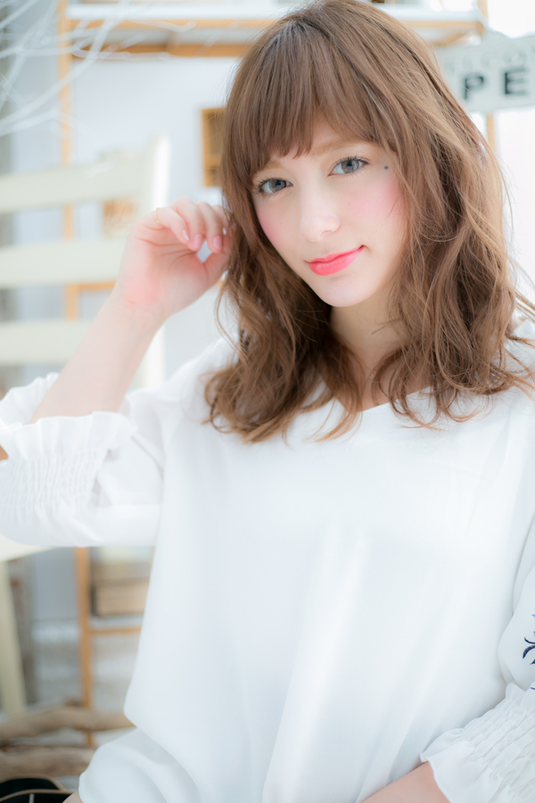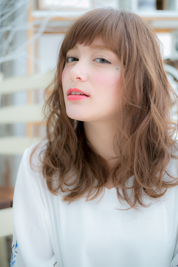 ゆる巻きカールと透け感バングで、やわらかフェミニンな印象に仕上げたエアリーセミディ。ラフな抜け感を残し、リラクシーで肩ひじ張らないエフォートレスな雰囲気に。旬顔にアップデート!(メイク担当:川口店 成田)