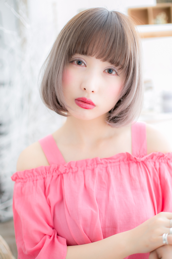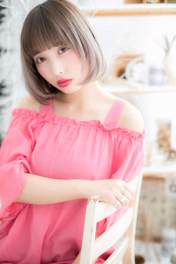 透け感あるフリンジバングやワイドバングで目元を強調して目力UP!頬を包み込むワンカールでフェイスラインをカモフラージュ。小顔に見せます。しっとりまとまるツヤ感を光を反射する透明感で、ハイトーンも上品に。好感度◎