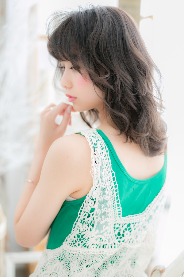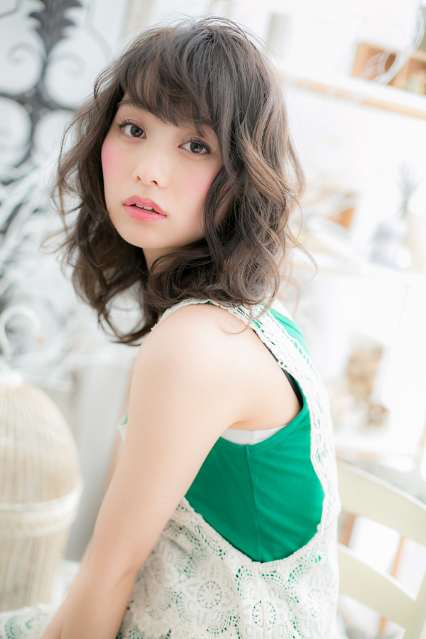 黒髪&ボリュームカールでグラマラスに仕上げたラフミディ。重く見えがちな黒髪は、似合わせカットとパーマで動きを出せば、ふんわり軽くやわらかに。ピュアな雰囲気の中に凛とした空気を漂わせて、大人かわいい印象に。