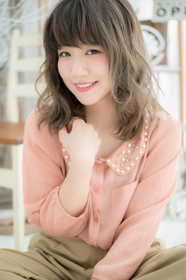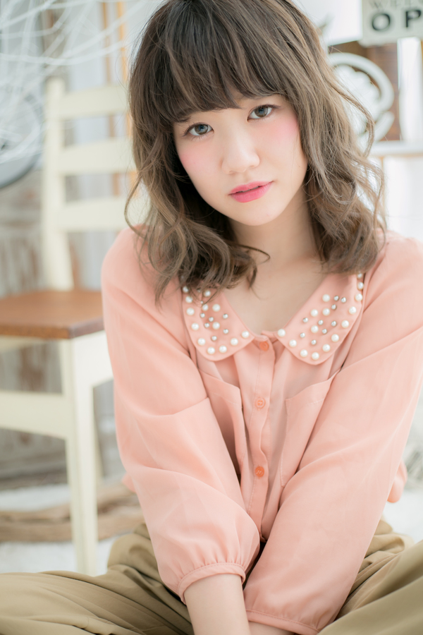 厚めバングとゆるふわカールの重めスタイルがガーリーでカワイイ♪カジュアルにもフェミニンにも合わせやすいマシュマロみたいなふわふわミディ。前髪が伸びてきたら、斜めバングやセンターパートで大人っぽくしても◎