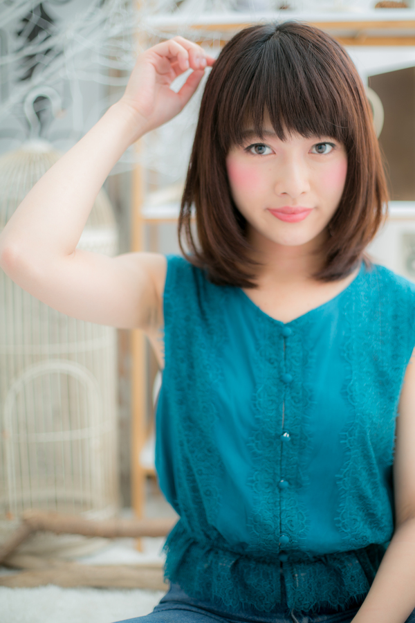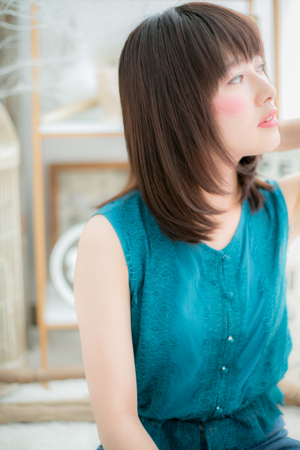 サイドのレイヤーでフェイスラインをカバーしているので、小顔対策もバッチリ!耳かけも上品で大人かわいい。ワイドバングでカジュアルな印象にしても、斜めバングでフェミニンにしても旬顔に。目力UPを狙って♪ヒアルロン酸カラーは白髪にも対応可。