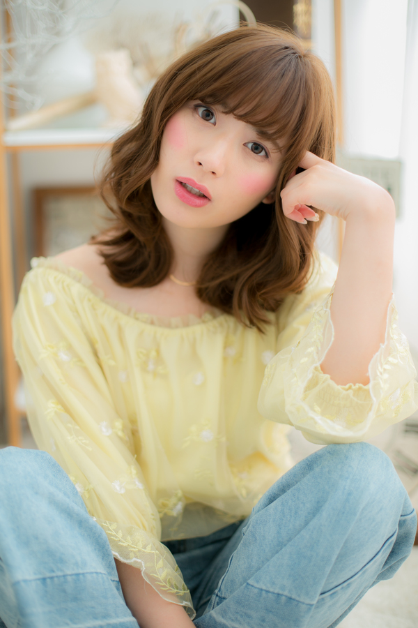 頬から丸みをつけるようにレイヤーを入れ、エアリーカールでふわふわ質感に仕上げたニュアンスミディ。透け感バングでフェミニンに、揺らめくカールで愛されスタイルに♪ベージュカラーやオレンジベージュで華やかに☆