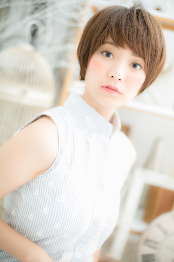 マッシュショートに、目の上ギリギリの斜めバングで目力UP!無駄を削ぎ落したコンパクトフォルムで、まとまる小頭ヘアに。トップにボリュームを持たせればスタイルUP効果も!(メイク担当:COVER HAIR グループ 成田)