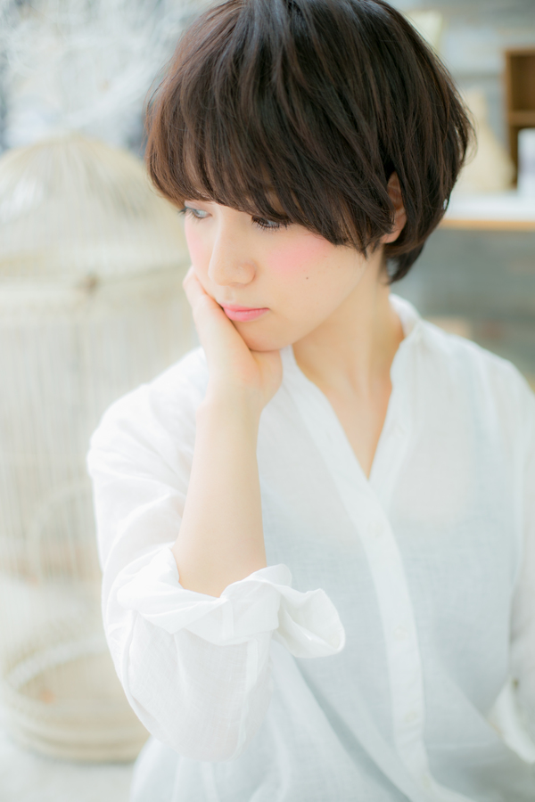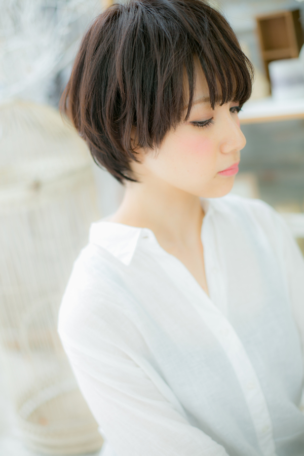 やわらかなワンカールの重なりのショート。長めの斜めバングや厚めバングで目元を印象つけて目力UP!耳かけでスッキリ見せた小顔スタイルも好感度大♪大人かわいいショートです。(メイク担当:COVER HAIR GROUP 近藤)